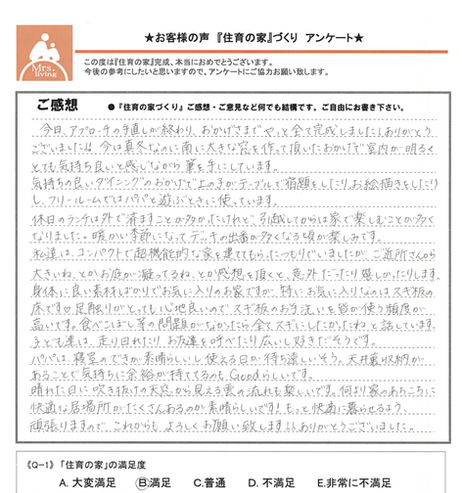 Q4. 実際に家づくりを進めていく過程はいかがでしたか? 夢マップなどのお陰で漠然と考えていたことを言葉にし、改めて自分の希望に気付くのは楽しい作業でした。色々ある希望の中からこれ!と決めることで『軸』(テーマ)がぶれなくて良いですね Q6. 「住育の家」プレゼンテーションはいかがでしたか?ここまでの満足度は? 大満足 すごい!!とかんじることばかりで、びっくり&楽しいです♪